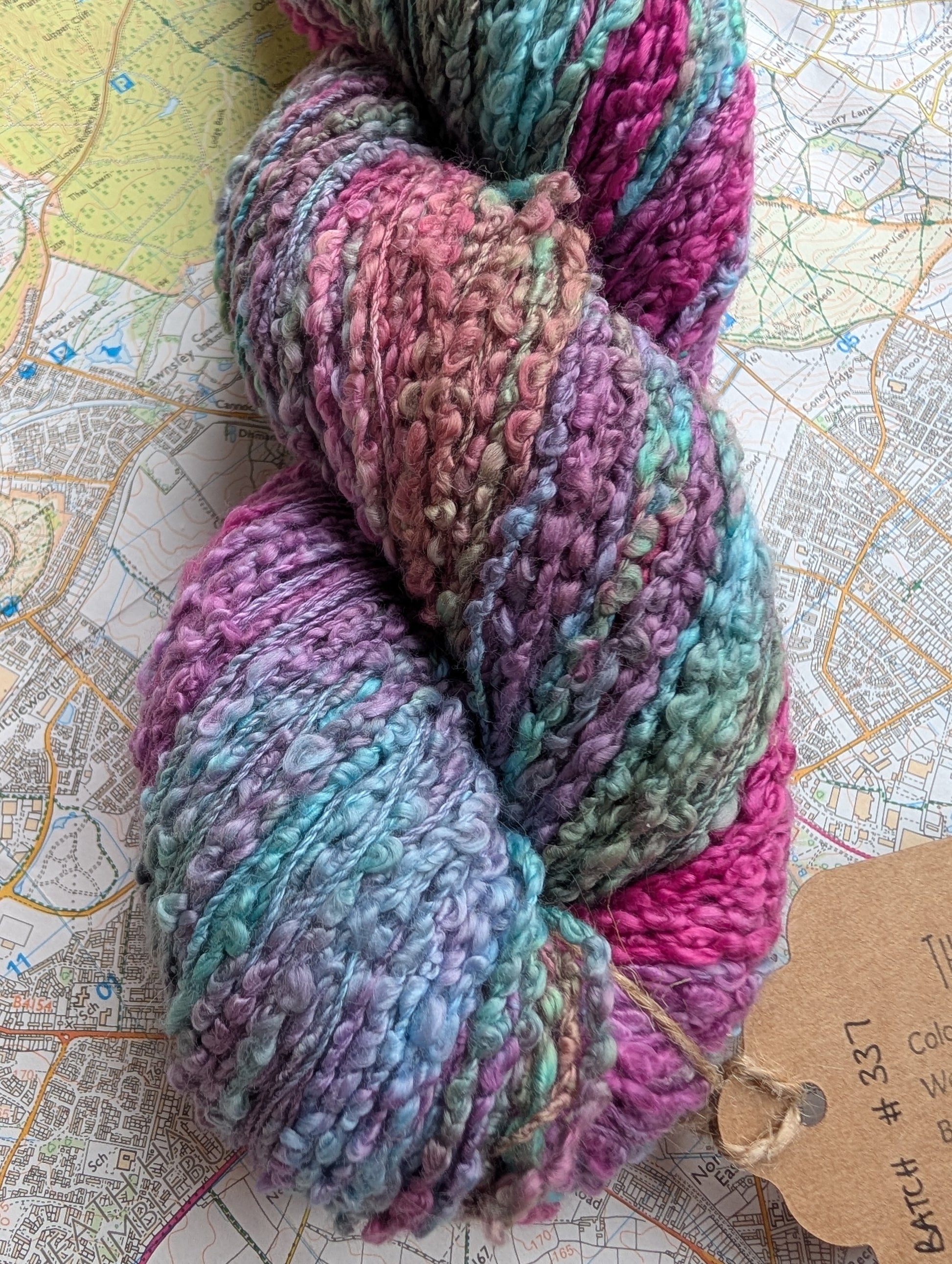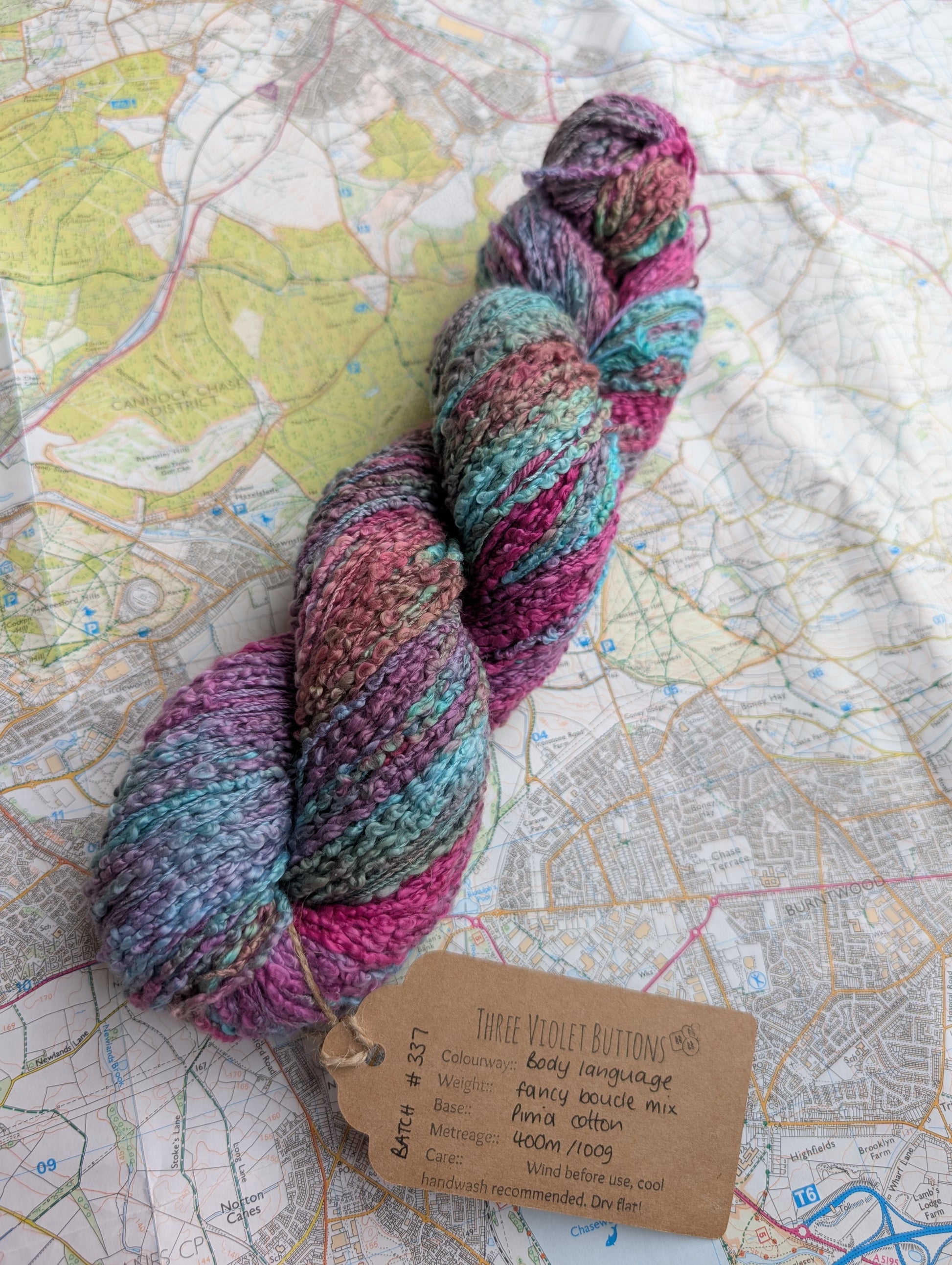 Beautifully soft pima cotton yarn dyed in purples and blues, pinks and greens. This is a really fun textured yarn that made up of thin even sections and boucle sections. I've seen this used with plain 4 ply in a scarf and it looked great!